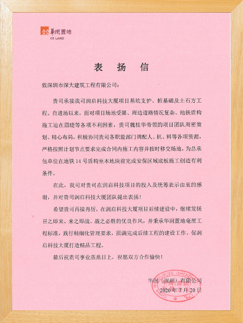 • 越秀·和樾府榮獲深圳鵬躍房地產開發有限公司表揚認可